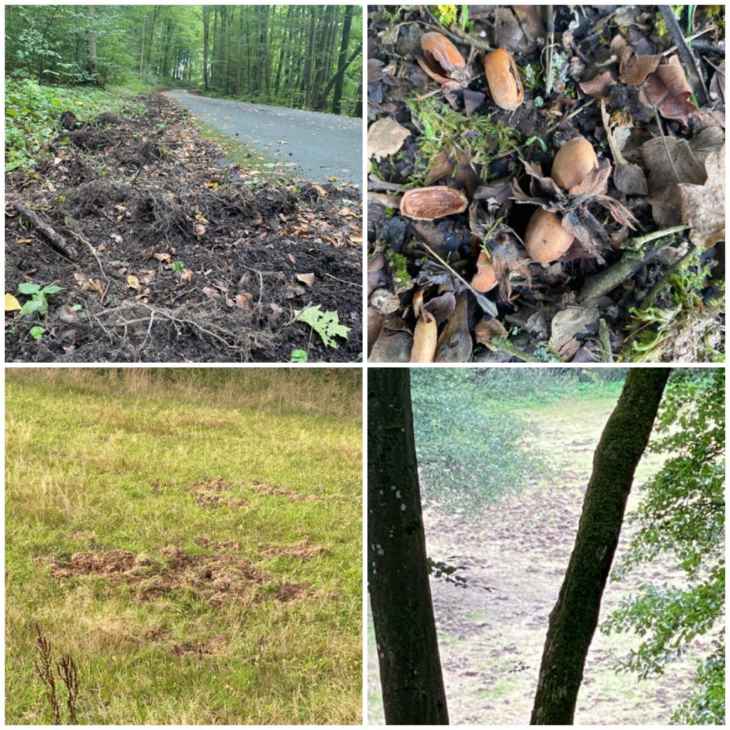 Herbstzeit. Die Eicheln fallen. Schon sind die Sauen dahinter her. Hier graben sie längs meines Wanderwegs die Wegeränder um. Sie fangen aber auch schon an, n den Wiesen nach dem ausgleichenden Eiweiß in Form von Würmern, Käfern, Larven zu suchen. Jäger, aufgepasst!